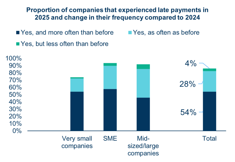 U posljednjih 12 mjeseci, 86% poduzeća prijavilo je kašnjenja (2023.: 82%, 2024.: 85%). Vrlo mala poduzeća posebno su pogođena, s prosječnim kašnjenjem od 44 dana, dok je kod velikih poduzeća 36 dana.