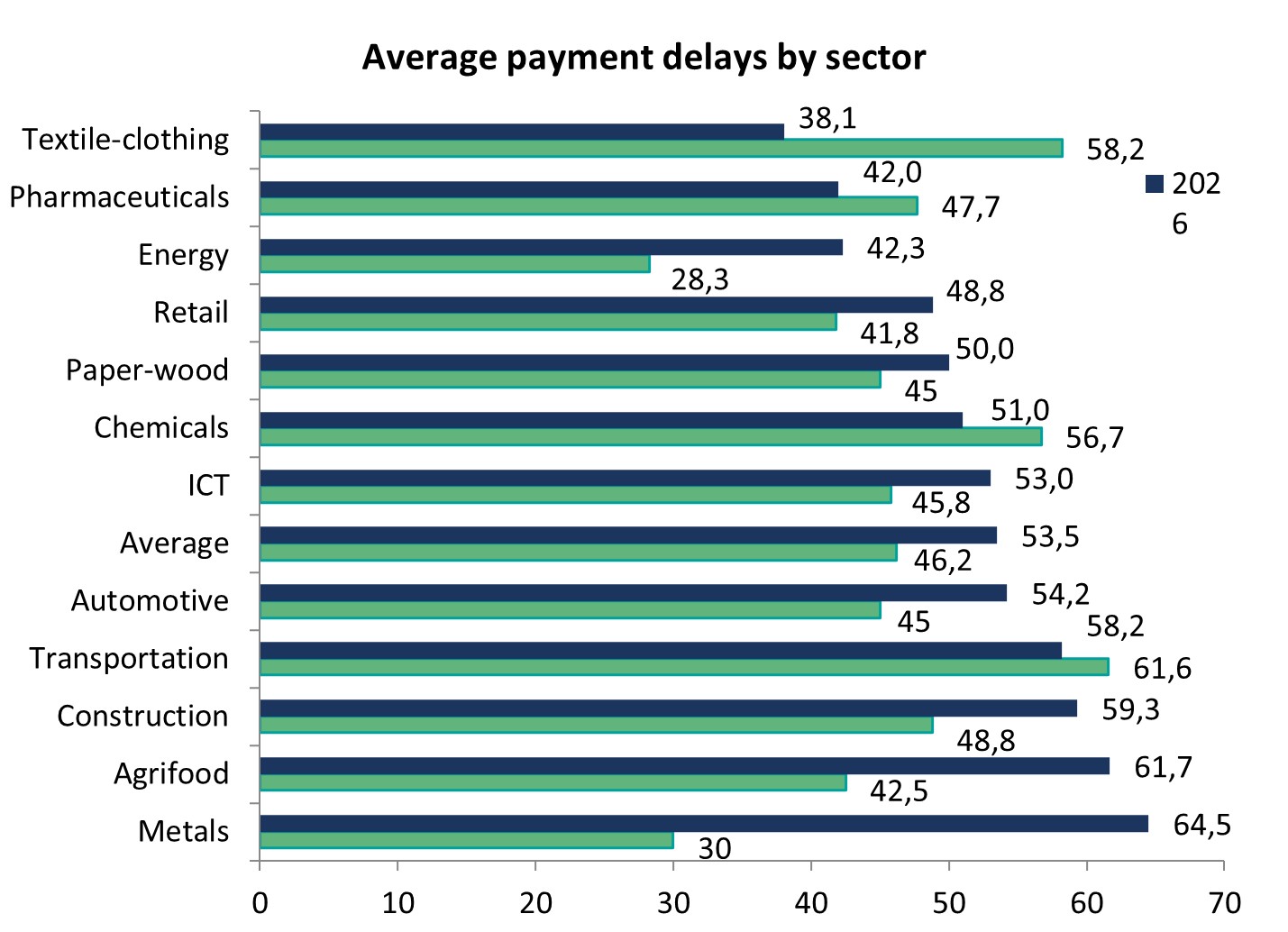Kašnjenja plaćanja pogoršala su se u većini sektora. Najdulja kašnjenja sada se bilježe u metalnom sektoru (64 dana), poljoprivredno-prehrambenom sektoru (61 dan) i građevinarstvu (59 dana). Udio tvrtki koje nemaju nikakvog zakašnjela plaćanja značajno je pao – s 14,6% na 8,5%, dok je dio onih čija je zakašnjela potraživanja značajno porastao za 20%.