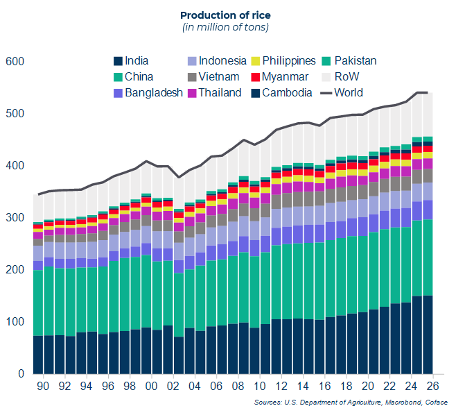 Od 2022. godine Indija, najveći svjetski izvoznik riže, ograničila je izvoz kako bi obuzdala rast svjetskih cijena (porast od 19% u 2022. i 2023.), uzrokovan prvenstveno ratom u Ukrajini i lošim vremenskim uvjetima u Aziji. Ponovno otvaranje izvoza u 2024., uz rekordne žetve u Aziji, dovelo je do pada cijena od 35% u godinu dana. S obzirom na pozitivne prognoze proizvodnje za 2026. i mogući povratak klimatskog fenomena La Niña u četvrtom tromjesečju 2025., očekuje se daljnji višak ponude u 2026. Cijene će vjerojatno nastaviti padati barem do kraja 2025., uz moguću stabilizaciju u 2026. na razinama koje nisu viđene već deset godina.