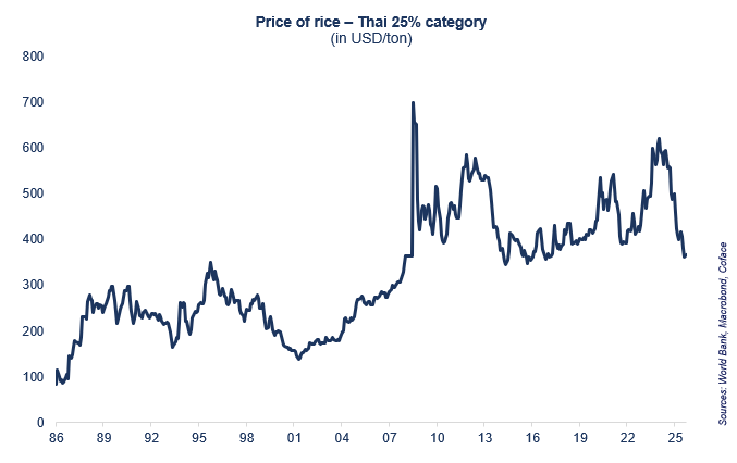 Cijene riže pale su za 35% u godinu dana, dosegnuvši najnižu razinu od 2017. (oko 360 američkih dolara po toni), nakon ukidanja indijskih izvoznih ograničenja. Nakon tri godine izrazite nestabilnosti, tržište se suočava s viškom ponude (541 milijun tona proizvedeno u 2024.), što dodatno snižava cijene i narušava ravnotežu među globalnim proizvođačima i uvoznicima.